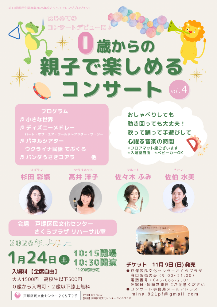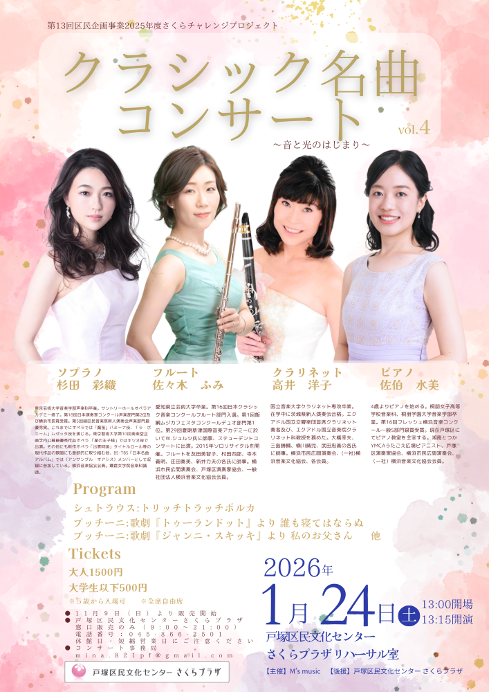 杉田彩織(ソプラノ)佐々木ふみ(フルート)高井洋子(クラリネット)佐伯水美(ピアノ)
